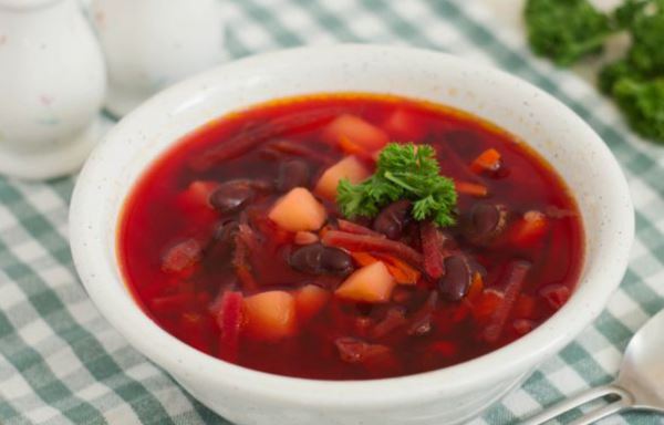 3. Добавьте свеклу и фасоль, доведите до кипения. Приправьте уксусом, солью и перцем. Подавайте с укропом.