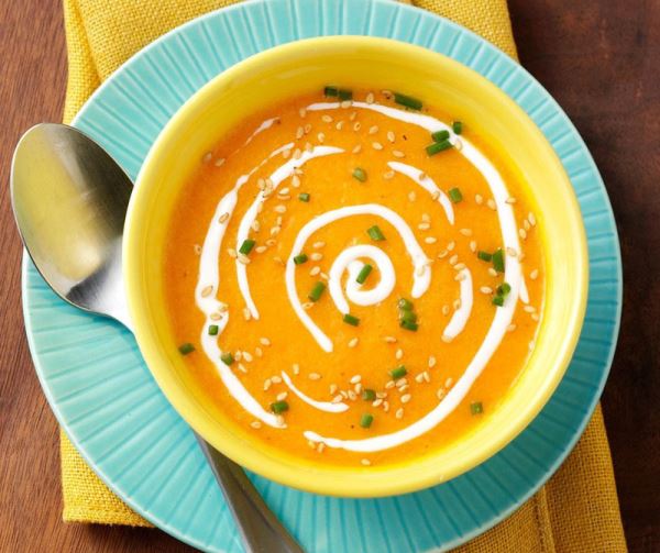 4. Измельчите суп блендером, добавьте кокосовое молоко, соль и перец. Перемешайте и подавайте горячим.