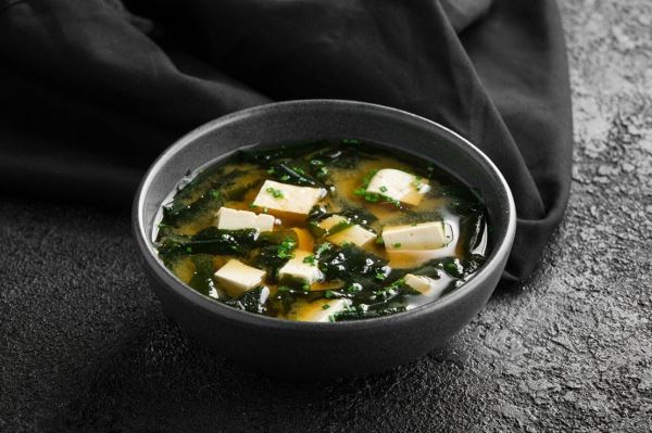 3. Нарежьте тофу и зеленый лук, добавьте в суп вместе с водорослями. Готовьте 5 минут, добавьте натертый имбирь. Подавайте горячим.