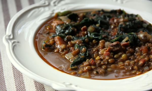 2. Добавьте чечевицу, чеснок и бульон. Варите 20 минут до готовности чечевицы.