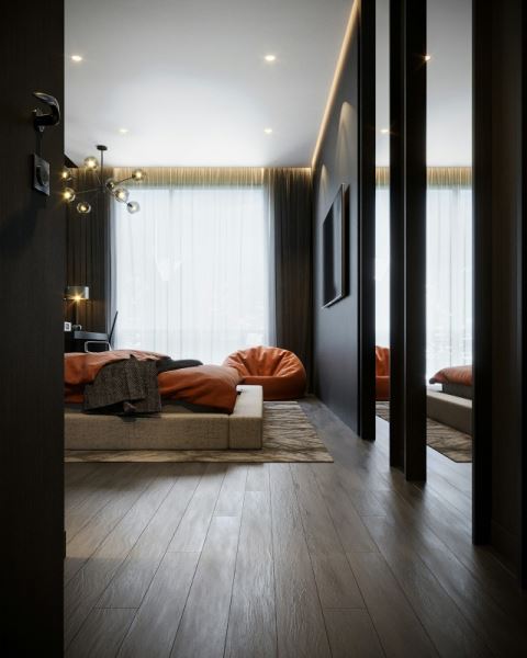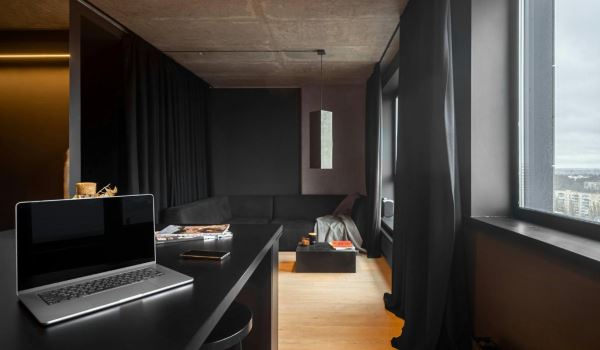 Полностью черная комната возможна, но только при правильном освещении и больших окнах. В маленьких пространствах без света такой прием почти всегда ошибка.