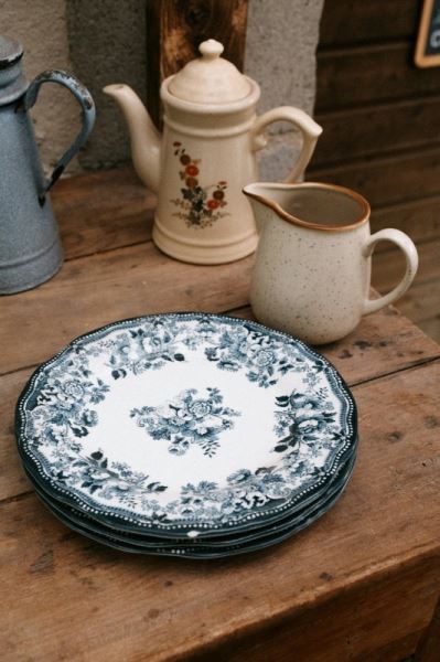 Посуда формирует атмосферу. Матовые керамические тарелки дают спокойный, современный вайб. Тонкий фарфор с узором добавляет торжественности. Винтажное стекло делает стол живым и теплым.