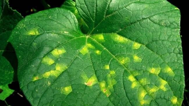 - Желтые участки становятся более обширными и имеют форму блоков, но часто ограничены жилками листьев – желтыми с одной стороны, зелеными с другой.