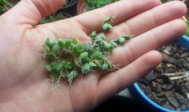 Толстянковые можно размножать отводками или семенами, но их так легко размножать детками, что редко возникает необходимость в других способах.Детки обычно опадают с материнского растения сами, но вы можете аккуратно отделить их от материнского растения, слегка повернув пальцами.Вы поймёте, что детки готовы к посадке, если они легко отделяются от листьев материнского растения!