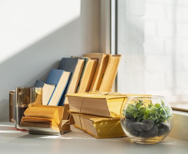 В принципе подоконник можно рассмотреть, как бесплатную готовую большую полку. Почему бы не разместить на ней книги, если другого места нет? Только вот на подоконник падает солнце, поэтому обложки рано или поздно выцветут. Да и ряды с книгами будут мешать полноценно открывать окна и проветривать помещение. Но за неимением других альтернатив, не самый худший вариант.