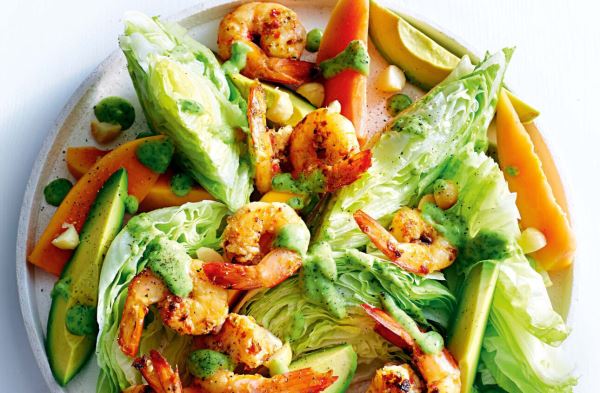 Креветки почистить и обжарить 2–3 минуты. Авокадо, манго и огурец нарезать кубиками. Смешать зелень, добавить обжаренные креветки. Заправка: сок лайма, масло, мед и щепотка чили. Хорошо перемешать и сразу подавать.