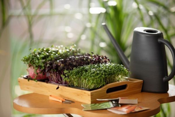 Микрозелень. Это не сорт, а стадия роста. Это может быть та же руккола, редис, подсолнечник, горох, брокколи, свекла. Их сеют очень густо в неглубокий контейнер. Через 7—10 дней, когда появится первая пара листьев, сочные ростки срезают ножницами. Это концентрат витаминов, минералов и яркий гастрономический акцент для любого блюда.