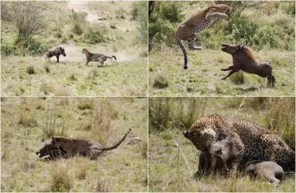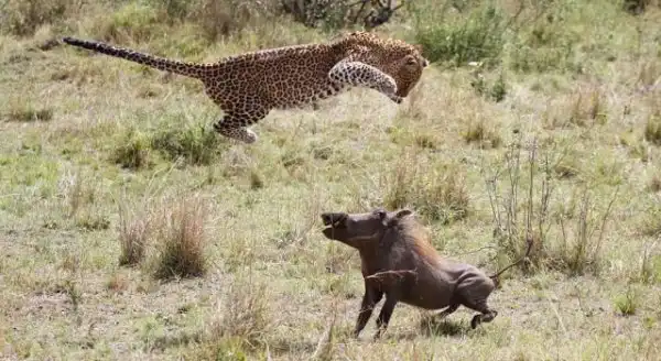 Захватывающие кадры охоты беременной самки леопарда на бородавочника снял 29-летний австралиец Питер Томпсон в заповеднике Масаи-Мара в Кении. Самка притаилась в кустах и покараулила бородавочника. Затем выпрыгнула перед растерянным кабаном. Хоть бородавочник и имеет острые клыки и довольно быстро бегает, спастись от леопарда у него шансов практически не было.